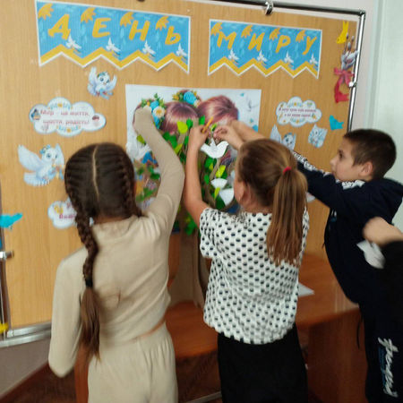 Захід проведено шкільною бібліотекою спільно з Казанківською публічною бібліотекою для учнів 4-х класів Казанківської гімназії №1. Школярі дізнались про історію свята, відповіли на запитання вікторини. А на завершення заходу виготовили білосніжних голубів, якими прикрасили дерево миру. і зробили фото на пам'ять.